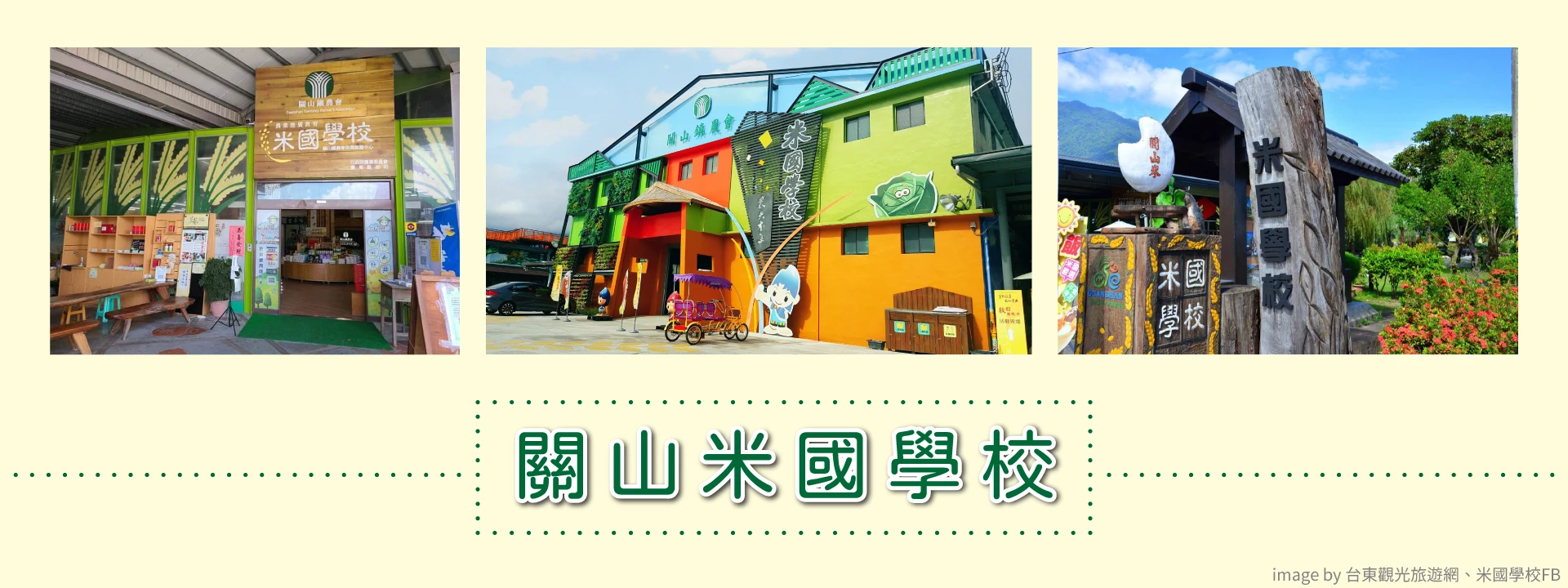 為推廣關山米與讓民眾體驗稻米處理過程,關山鎮農會休閒旅遊中心將舊碾米廠改建成米國學校。米國學校位於台9線道路旁,牆面上漆上米寶寶的圖樣,十分好認,園內擺設也十分富有朝氣。